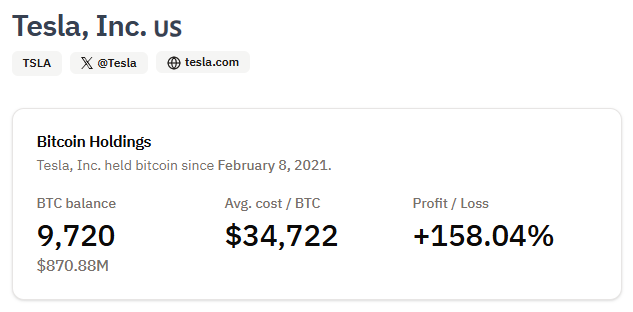 随着比特币的大涨,比特币“巨鲸”们自然也赚得盆满钵满。BitcoinTreasuries数据显示,最近“赢麻了”的特斯拉在比特币投资上也获利不小。作为美国上市公司中的第四大比特币持有者,特斯拉目前持有的比特币数量为9720枚,截至发稿时的总价值约为8.7亿美元,收益达5.32亿美元(约合38.5亿元人民币),利润率为158%。