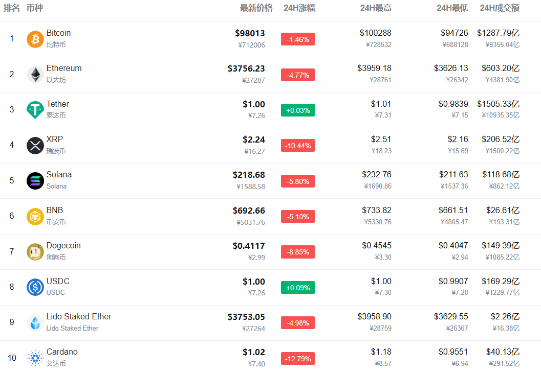 其他加密货币多数走低,以太坊日内跌4.77%,狗狗币、艾达币、币安币等纷纷下跌。