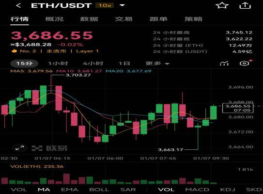 以太坊ETH今日实时价格行情分析预测,从欧易OKX交易软件平台提供的数据来看,截至[2025年1月7日],以太坊ETH最新价格为3,686.55美元,较前一交易日略有下降,跌幅为0.02%。在24小时内,以太坊ETH最新价格最高价达到3,745.12美元,最低价为3,622.22美元,24小时交易量为12.49万ETH,交易额达到4.59亿美元。