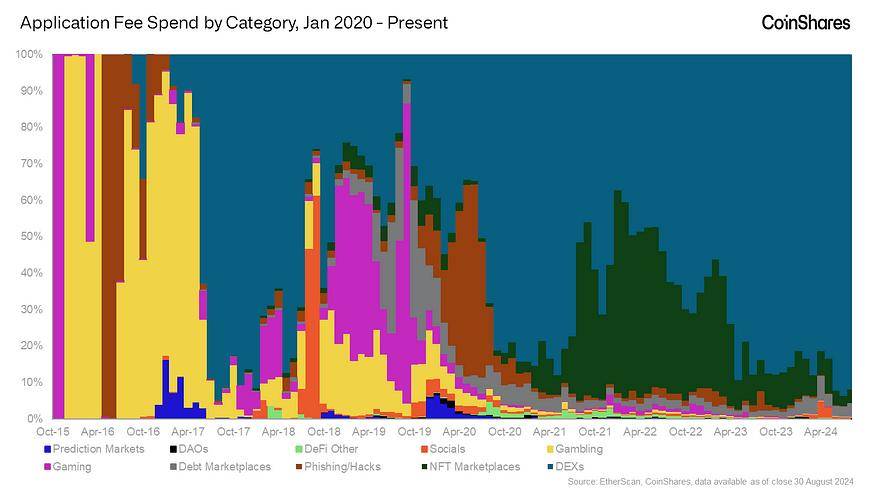 如今,按交易费计算,90% 以上的使用都是在市场上。如上所示,这是一个剧烈的转变——游戏、网络钓鱼诈骗和 NFT 应用程序周期性地占据主导地位——但自 2020 年夏季以来,以 Uniswap 为首的链上交易所(通常称为 DEX)或多或少一直是以太坊上的主要用例。