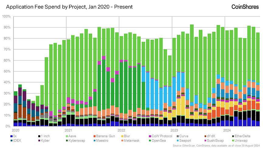 仅 Uniswap 就持续占据了以太坊交易费用的很大一部分——2024 年上半年为 15%。这证明了以太坊提供的核心价值以及其用户对自由投机数字资产(如 ETH、应用程序代币和稳定币)的能力。