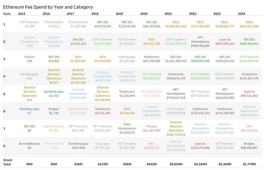 到目前为止,我们已经了解了以太坊使用的每个主要类别,并深入了解了每个类别中的相关驱动因素。现在,我们将把所有这些结合起来,看看哪些特定服务在所有细分市场中需求最高。