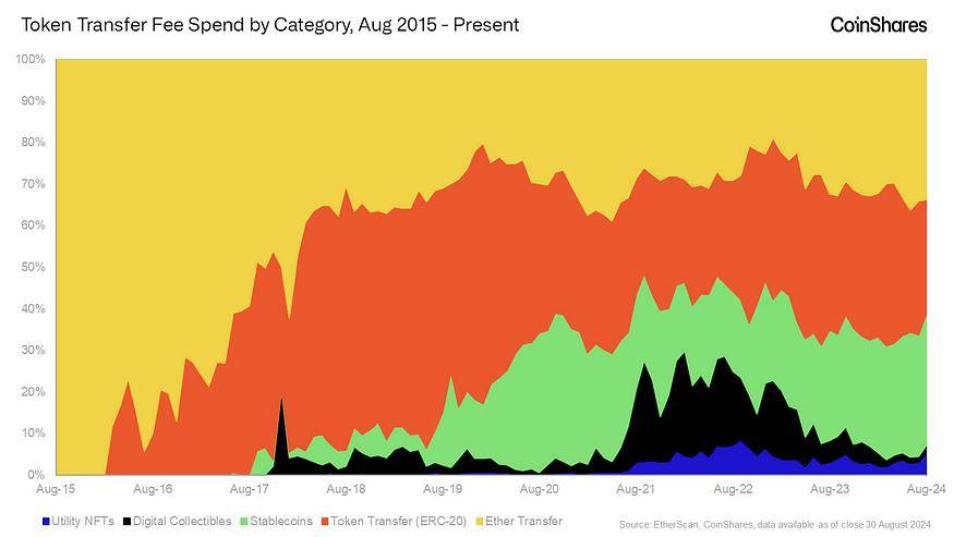 总体而言,尽管以太坊的转账活动随着时间的推移而多样化,但以太币和稳定币仍然是交易费用的主要驱动因素。这表明 ETH 作为网络原生资产的持续重要性以及稳定币在整个行业中发挥的关键作用。我们认为,稳定币是多年来出现的加密平台最有可能持续、最直观的用例之一。