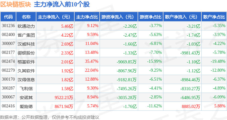 从资金流向上来看,当日区块链板块主力资金净流出63.16亿元,游资资金净流出5.43亿元,散户资金净流入68.59亿元。区块链板块个股资金流向见下表:
