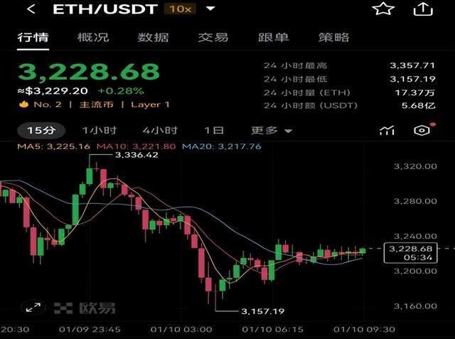 截至2025年1月10日,在欧易OKX交易所以太坊ETH最新价格为$3,228.68,相较于前一日上涨了$0.28%。这一价格反映了以太坊ETH在当前市场环境下的短期表现。从日内价格波动来看,24小时内以太坊ETH最新价格最高达到了$3,357.71,最低则为$3,157.19,显示出一定的价格波动幅度。同时,24小时的交易量(ETH)为17.37万,交易额(USDT)达到了5.68亿,这些数据表明以太坊ETH在市场上仍然保持着较高的活跃度和流动性。