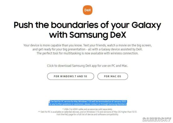 三星方面宣布:自2022年1月起,将停止Dex在macOS系统和Windows7(以及更早版本)系统上的服务支持。
