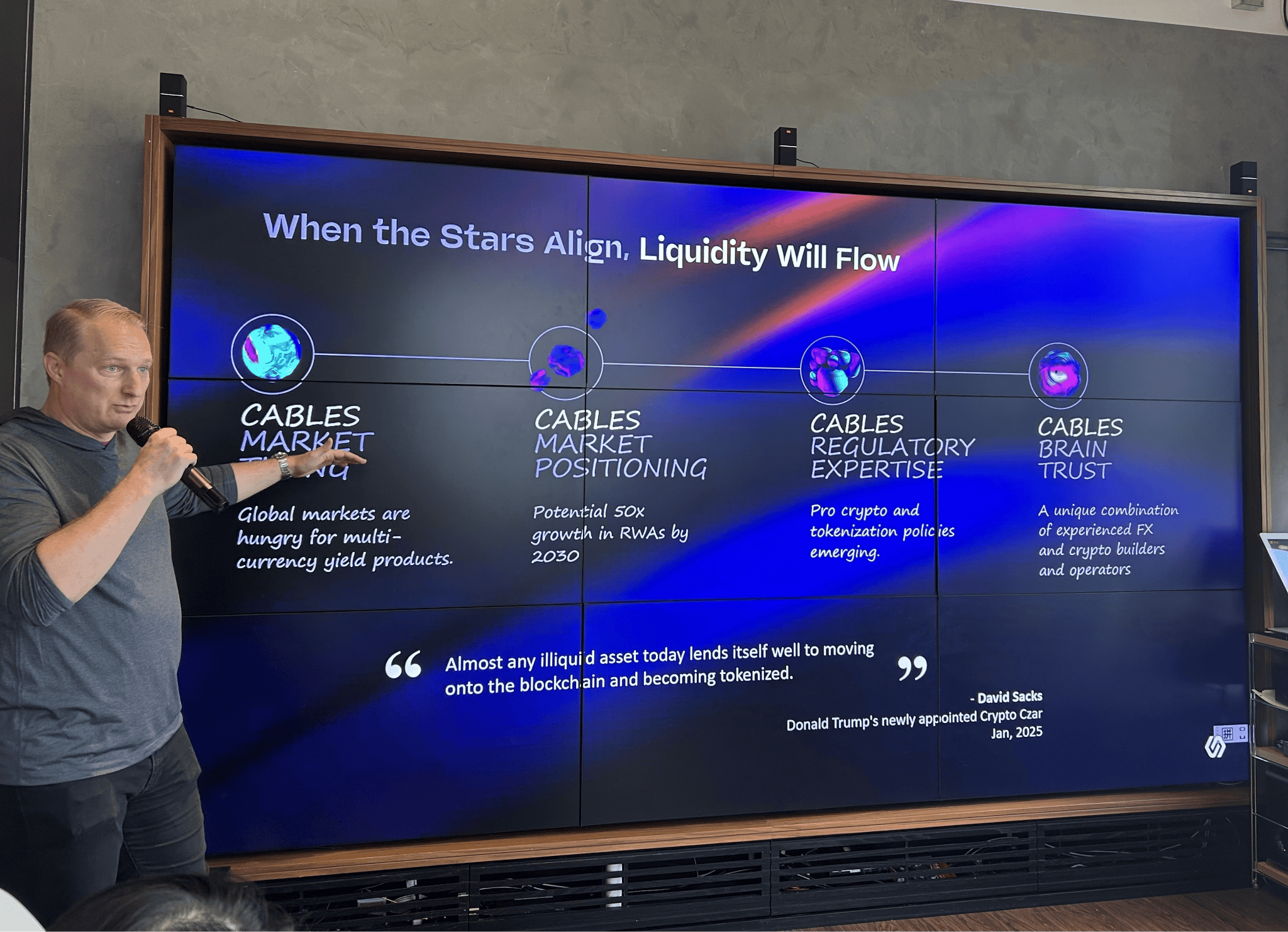 周三,Cables 联合创始人 Matt Miller 登上舞台,详解 Cables Finance 如何通过 RWA 支持的流动性质押代币及永续合约 DEX 解决核心痛点。现场听众反响热烈——人们开始意识到将生息资产引入链上、赋予其交易与流动性市场应用场景的真实潜力。