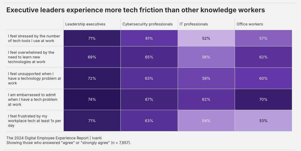 仔细观察技术摩擦如何影响员工和组织。很大一部分办公室职员表示,他们在工作中面临着技术方面的挑战——无论是由于使用的工具数量过多而产生的压力,还是因遇到技术相关问题而产生的尴尬。