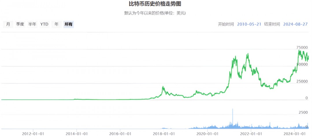 · 比特币作为第一个也是最具代表性的数字货币,自2009年诞生以来,经历了多轮牛市和熊市。但从整体趋势来看,比特币的价格始终呈现上涨的趋势。例如,比特币在2011年的价格不到1美元,到了2017年底突破了2万美元,2020年末再次突破3万美元,而在2021年,价格一度攀升至近6万美元,2024年8月,价值更是突破7.5万美元!